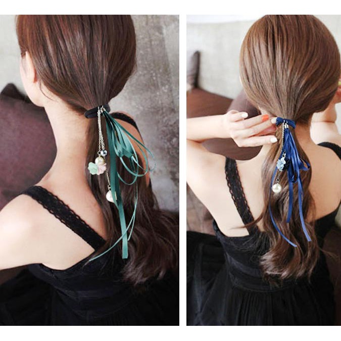 ยางรัดผม แต่งริบบิ้น ดอกไม้ และอะไหล่ตุ้งติ้งประดับมุก สไตส์เกาหลี สวยน่ารัก สไตล์เรียบเก๋ งานจริงสวยเหมือนแบบ ใช้ในวันสบายๆ เที่ยว ทำงาน ออกงาน ได้หลากหลายโอกาส มีสี : สีนำเงิน / เขียว / สีเทา / สีชมพู จำนวนจำกัด สินค้าพร้อมส่ง